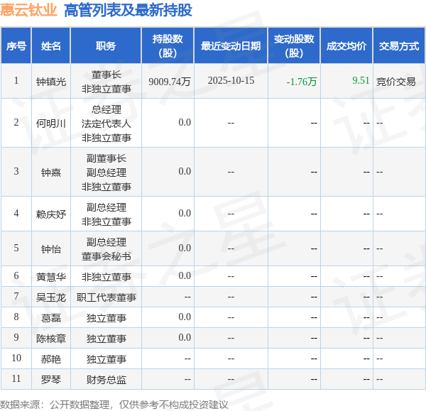 惠云钛业近半年内的董监高及核心技术人员增减持详情如下:
