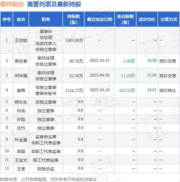 泰祥股份近半年内的董监高及核心技术人员增减持详情如下: