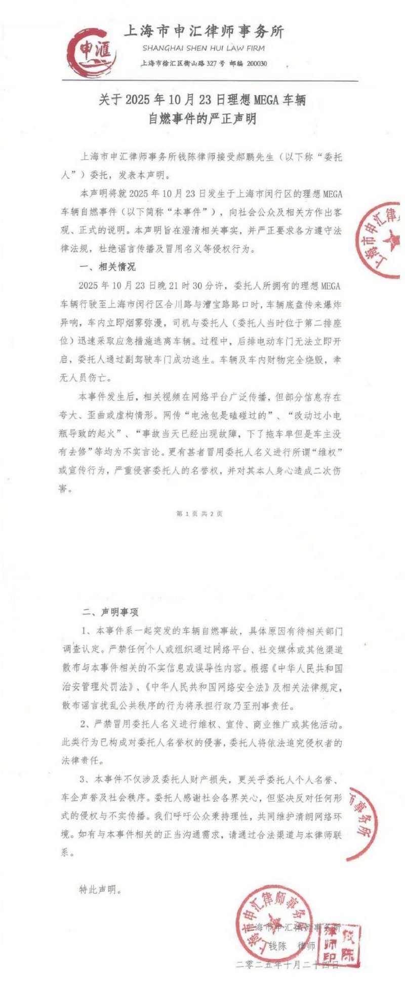 易车讯 10月24日,上海申汇律师事务所接受车主委托发布声明:2025年10月23日晚21时30分许,委托人所拥有的车辆行驶至上海市闵行区合川路与灌宝路路口时,车辆底盘传来爆炸异响,车内立即烟雾弥漫,司机与委托人(委托人当时位于第二排座位)迅建采取应急措施逃离车辆。过程中,后排电动车门无法立即开启,委托人通过副驾驶车门成功逃生。车辆及车内财物完全烧毁,幸无人员伤亡。