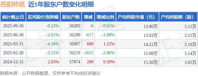 从股价来看,2025年6月30日至2025年9月30日,岳阳林纸区间跌幅为0.23%,在此期间股东户数减少8.0户,减幅为0.01%。