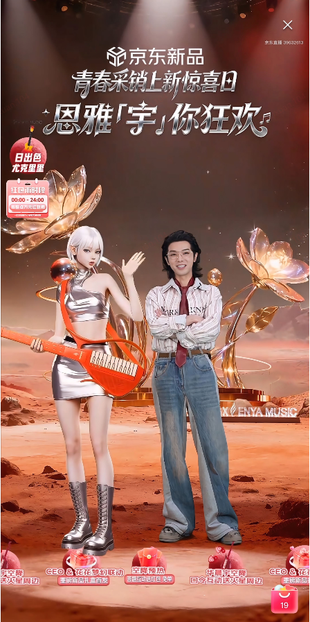 依托JoyAI大模型诞生的虚拟偶像“Aura”成为近期焦点。10月23日京东上新惊喜日当晚,华语乐坛实力唱将华晨宇空降京东青春采销直播间,在火星虚拟场景中,华晨宇与京东JoyAI大模型生成的虚拟偶像Aura同框亮相——两位恩雅品牌全球代言人,共同开启精彩的跨次元互动,用科技感十足的场景与联动形式,为用户带来打破次元壁的直播体验。