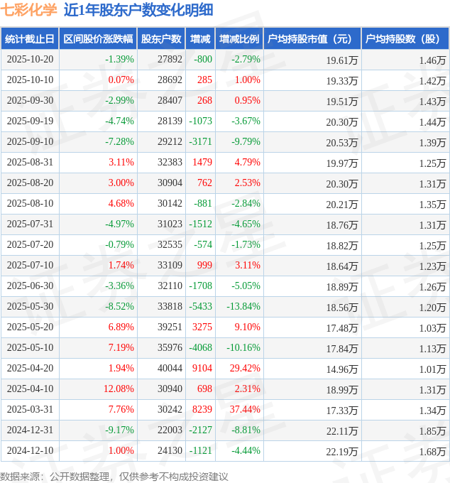 从股价来看,2025年10月10日至2025年10月20日,七彩化学区间跌幅为1.39%,在此期间股东户数减少800.0户,减幅为2.79%。
