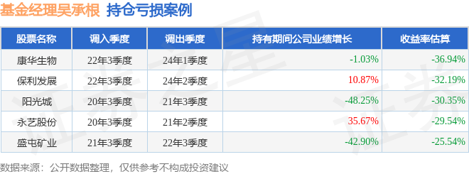 重仓股调仓示例详解: 1、远兴能源(000683)翻倍案例: 吴承根管理的中庚价值灵动灵活配置混合基金在21年2季度买入远兴能源,在持有1个季度后在21年3季度卖出。持有期间的估算收益率为170.77%,持有期间远兴能源在2020年到2021年的年报归属净利润增幅达7166.09%。 2、中航重机(600765)调仓案例: 吴承根管理的中庚价值灵动灵活配置混合基金在20年2季度买入中航重机,在持有2个季度后在20年4季度卖出。持有期间的估算收益率为78.79%,持有期间中航重机在2019年到2020年的年报归属净利润增幅达24.91%。 3、康华生物(300841)调仓案例: 吴承根管理的中庚价值灵动灵活配置混合基金在22年3季度买入康华生物,在持有1年又2个季度后在24年1季度卖出。持有期间的估算收益率为-36.94%,持有期间康华生物在2022年到2024年的年报营业总收入降幅为1.03%。