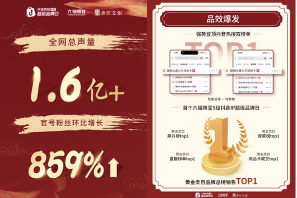 六福珠宝以打造自身S级抖音IP超级品牌日的方式,打通从文化种草到即时转化的最短路径,通过开屏广告、信息流、穿越盛唐全民挑战赛、抖音珠宝行业360°创意短视频等多种形式全面渗透,以盛唐文化为内核精准激发当代消费者的文化自信情感共鸣,实现品牌宣传及销售双丰收,超品日期间,一举包揽黄金类目五大榜单TOP1(销售榜、直播榜、飙升榜、搜索榜、商品卡成交榜),此外,联名单品「唐彩菱」种草内容更登顶抖音热榜总榜、热搜种草榜TOP1,成功带动线下销售热潮,出现多家门店到货即售罄、现货紧缺现状。官方内容与多账号协同直播同步发力,官宣视频单条播放量超500万,全域曝光量逾千万,推动官方账号粉丝环比增长859.7%,创下年度新高。