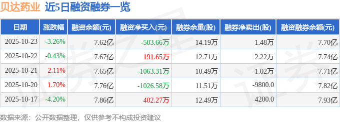 贝达药业融资融券信息显示,融资方面,当日融资买入3600.5万元,融资偿还4104.17万元,融资净偿还503.66万元。融券方面,融券卖出1.73万股,融券偿还2500.0股,融券余量14.19万股,融券余额799.48万元。融资融券余额7.7亿元。