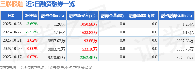 三联锻造融资融券信息显示,融资方面,当日融资买入5836.56万元,融资偿还4785.59万元,融资净买入1050.98万元,连续3日净买入累计2833.68万元。融券方面,融券卖出0.0股,融券偿还0.0股,融券余量0.0股,融券余额0.0万元。融资融券余额1.26亿元。
