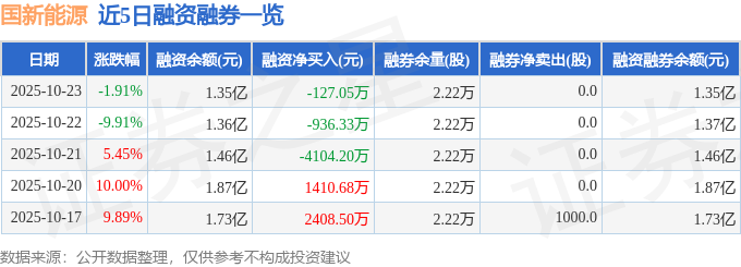 国新能源融资融券信息显示,融资方面,当日融资买入4938.77万元,融资偿还5065.82万元,融资净偿还127.05万元。融券方面,融券卖出0.0股,融券偿还0.0股,融券余量2.22万股,融券余额9.1万元。融资融券余额1.35亿元。
