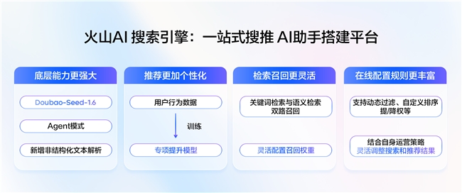 AI大模型浪潮之下,搜索正在从一个单纯的信息检索工具,演进为一种更自然、更智能的交互范式。此次升级后,火山AI搜索引擎的底层能力全面提升:底层大模型升级到的豆包大模型1.6,对话问答架构全面升级到Agent模式。同时,推荐更加个性化,检索与召回更灵活,可根据具体业务策略,动态调整搜索与推荐结果。