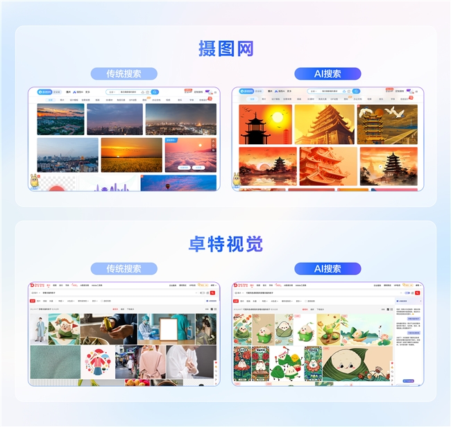 在视觉素材行业,传统搜索高度依赖人工标注与关键词匹配,导致空搜率高、优质素材难以触达。火山AI搜索引擎通过多模态理解与语义解析能力,为摄图网、卓特视觉等平台提供AI搜索,带来全新交互模式。这一过程无需人工标注,不仅显著提升平台用户的搜索效率与成功率,更有效激活平台长尾素材价值,推动用户粘性与付费转化的双重增长。
