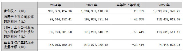 2023年至2024年,公司营业收入分别为12.85亿元、9.03亿元,归属于上市公司股东的净利润分别为1.94亿元、9,901.45万元,归属于上市公司股东的扣除非经常性损益的净利润分别为1.78亿元、8,297.33万元,经营活动产生的现金流量净额分别为2.19亿元、1.46亿元。