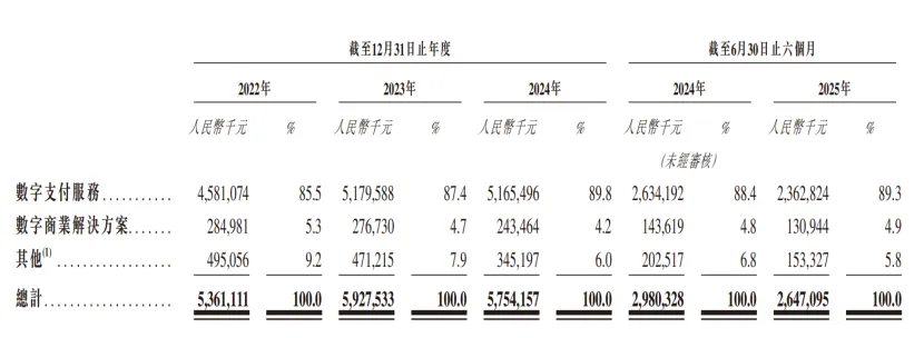 分业务来看,数字支付服务占比近9成。2022-2024年、2025H1,数字支付服务营收分别为45.81亿元、51.80亿元、51.65亿元和23.63亿元,占比分别为85.5%、87.4%、89.8%和89.3%。