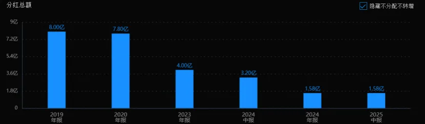 2019年,拉卡拉刚刚上市募资12.32亿元后,就分红超过8个亿,几乎是全年归母净利润的100%;2020年,拉卡拉再次分红7.8亿元,股利支付率高达83.78%;2023年,又分红4个亿,股利支付率达到87.34%;2024年更是分红4.78亿元,而当年净利润仅3.51亿元,分红金额远超当年净利润;2025年上半年,再派现1.58亿元。