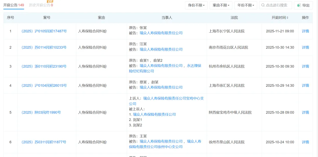 根据天眼查,截至目前,瑞众人寿作为被告的开庭案件已达149起,覆盖全国20余个省市,涵盖“人身保险合同纠纷”“人寿保险合同纠纷”等争议。