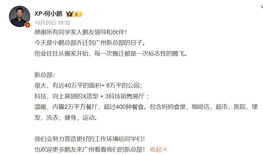 在一切向好的趋势下,投资40亿元建设新总部、谋求更高发展在情理之中。小鹏汽车董事长何小鹏也是意气风发地表示:“创业往往从搬家开始,每一次搬迁都是一次标志性的腾飞。新总部很大,有近40万平的面积+8万平的公园。”