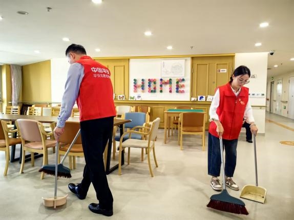 教育活动与义诊结束后,志愿者们并未停歇。他们拿起清洁工具,认真协助整理活动室、阅览区等公共区域的环境卫生,擦拭桌椅,归置物品,为老人们营造更加整洁舒适的生活环境。随后,志愿者们主动围坐在老人身边,细致询问老人的生活起居、身体状况,认真倾听老人讲述过往故事和生活诉求。最后,将带来的柔软慰问毯一一分发给老人们,一条条温暖的毯子,承载着平安健康险上海分公司对长者们深切的关爱与重阳节的美好祝福。