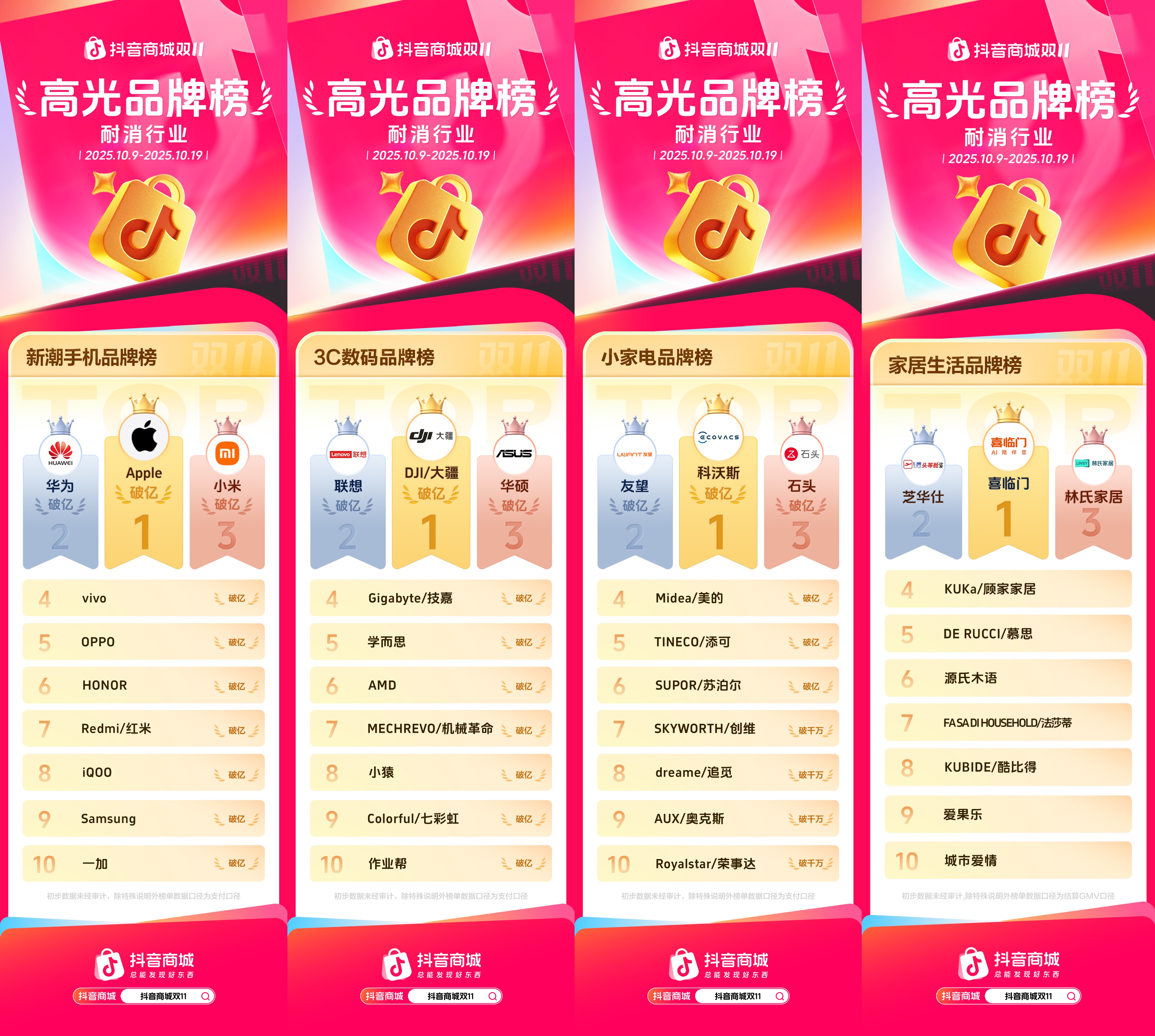 越来越多的消费者习惯在抖音商城下单手机、3C数码、小家电、家居生活等耐消产品,各细分行业品牌收获生意增长。其中,手机、3C数码品牌榜TOP10销售额均破亿,苹果、华为、小米占据新潮手机品牌榜三甲;大疆、联想、华硕名列3C数码品牌榜前三;小家电品牌榜中,科沃斯、友望、石头斩获TOP3;喜临门、芝华仕和林氏家居位列家居生活品牌榜前三。