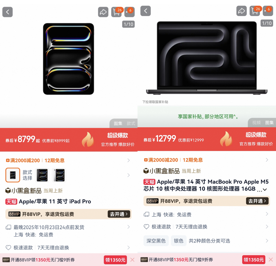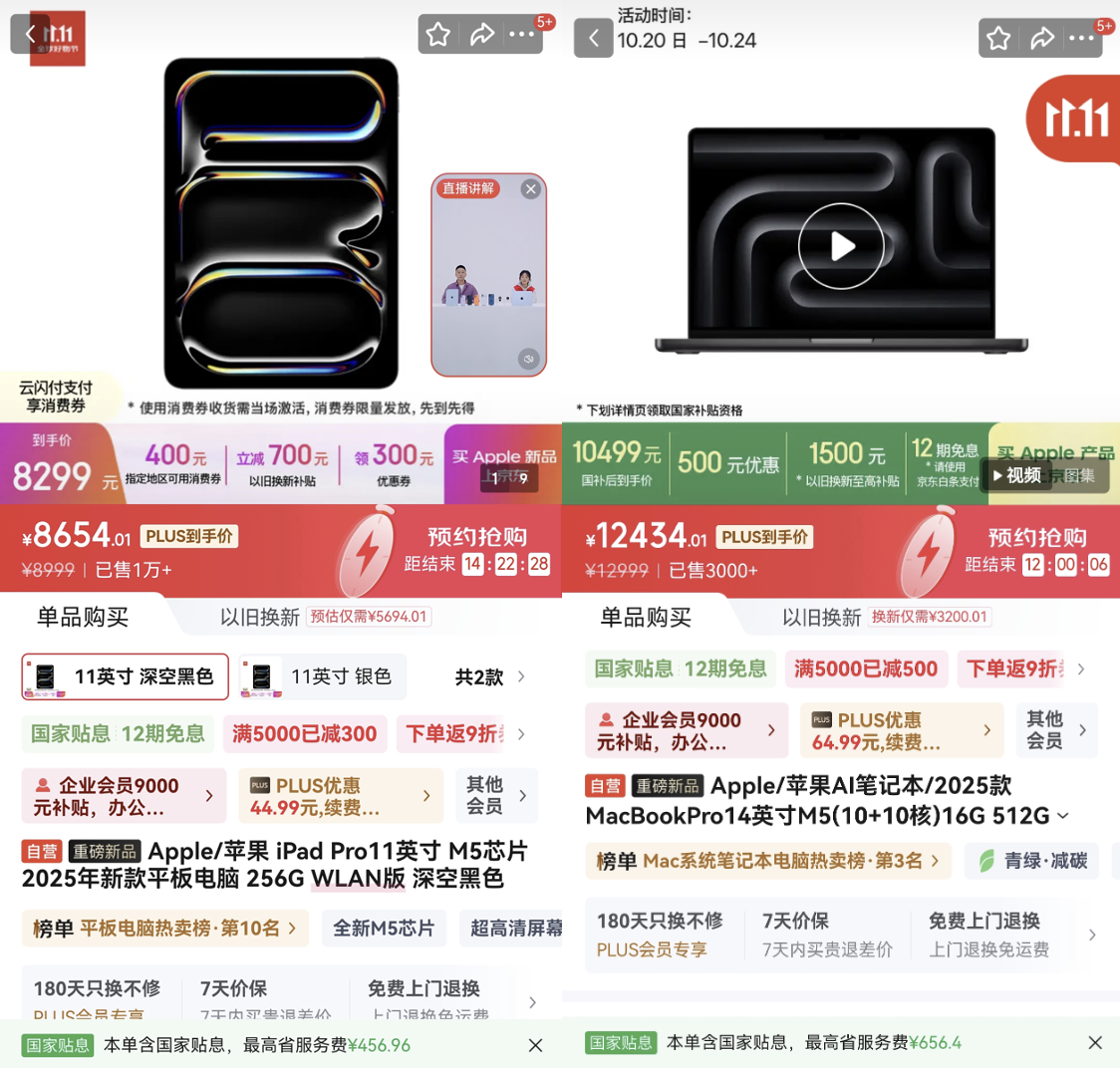 10月22日,搭载M5芯片的MacBook Pro、iPad Pro正式开售,起售价分别为12999元与8999元。随着新品上市恰逢双11大促节点,各大电商平台也纷纷推出相应购买权益,展开新一轮的市场竞争。从目前公开信息来看,不同平台针对这两款新品的优惠方式差异明显,消费者在选购前建议多方对比。