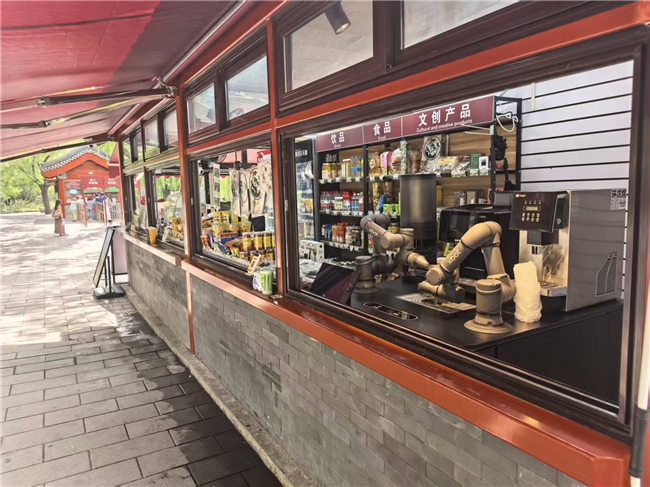 走进北海公园东码头便利店,一台灵活操作的咖啡机器人正吸引着游客驻足。只需 75 秒,它便能完成研磨、拉花、出杯全过程,还能将北海的湖光塔影化作独一无二的奶泡印花。