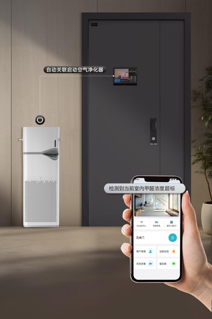 为了解决这一困扰万千家庭的健康隐患,王力安防历时两年多研发研发出“甲醛哨兵监测技术”,率先将高精度、全天候的甲醛监测功能融入防盗门中,让防盗门从物理屏障变身健康卫士,精准填补了行业空白。该技术可实现24小时持续监测,覆盖甲醛、PM2.5、温湿度等关键环境指标,精准匹配安全标准。当甲醛浓度>0.08mg/m3或者PM2.5>75μg/m3时,门体智能大屏与手机APP将会同步发出警报提示用户,关注风险信号。并能联动全屋新风系统、爱感空气净化器和王力智能窗,真正实现“监测+治理“的健康防护闭环。