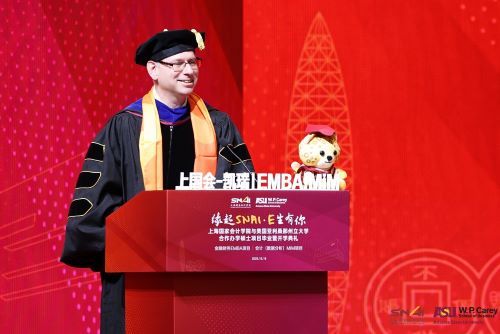 上海国家会计学院院长、党委副书记卢文彬在致辞中向毕业生和新生分别致以祝贺与欢迎,并对美国亚利桑那州立大学多年来的精诚合作表示感谢。他说,2025年,上国会-凯瑞金融财务EMBA项目在英国《金融时报》全球EMBA百强榜单中位列中国第5、全球第9,连续三年跻身全球前10,这一卓越成绩离不开双方的共同努力与相互支持。