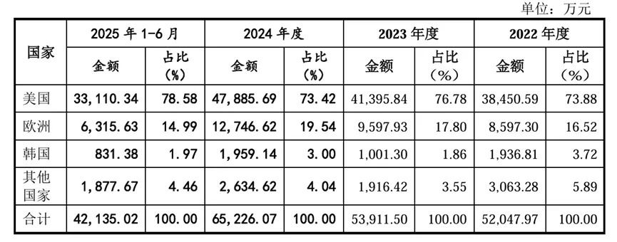 境外市场的单一依赖加剧经营波动。2022年至2025年6月份,境外收入均超90%,且持续攀升,2025年上半年更是达到96.54%,而美国市场的营收超达七成以上。雪上加霜的是,美国对医疗产品加征的关税已从公司与客户分担转为全额承担,2024年仅此一项就侵蚀914万元营业利润,占比达9.58%。交易所在问询中重点提到“说明加征关税的具体情况,对发行人经营业绩的影响及应对措施的有效性”。但从美国市场营收持续增长的情况来看,爱舍伦对美国市场的依赖性越发严重,当前愈演愈烈的贸易摩擦环境很可能会对公司的营收产生致命性的打击。