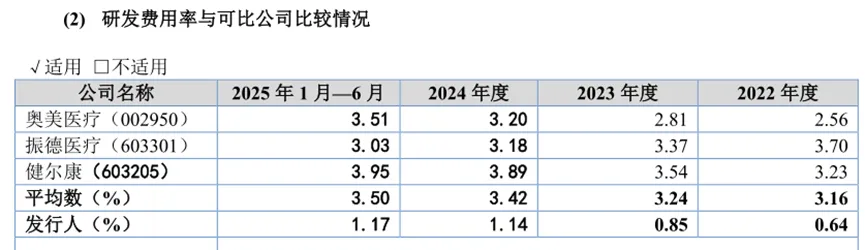 研发投入强度远未达标。2022年至2025年上半年,公司研发费用率分别仅为0.64%、0.85%、1.14%和1.17%,不仅不足同行业3%以上均值的一半,更未达到北交所对创新企业“最近三年研发投入占比不低于3%”的量化要求。从绝对金额看,其累计研发投入仅1500万元左右,而奥美医疗仅2024年研发费用就达1.06亿元,差距堪称天壤之别。更讽刺的是,公司董事监事薪酬合计超1600万元,研发投入尚不及此数。