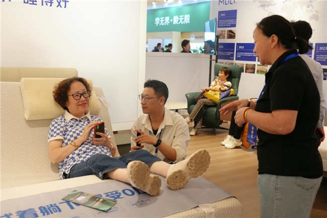 在展会现场,梦百合展品受到老年观众的热切关注,梦百合专业服务人员积极引导老年观众试睡体验,并深度融合老年教育场景,从人体脊椎结构、物理压力、床垫材质特性、智能科技等角度,为老年人分析睡眠问题的产生及应对。
