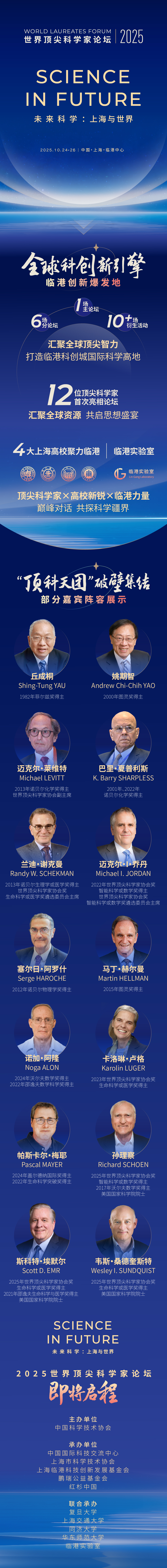 据介绍,2025世界顶尖科学家论坛以“未来科学:上海与世界(Science in Future)”为主题,将于10月24日-26日在上海临港中心举办。本届论坛由中国科学技术协会主办,中国国际科技交流中心、上海市科学技术协会、上海临港科技创新发展基金会、鹏瑞公益基金会、红杉中国承办,复旦大学、上海交通大学、同济大学、华东师范大学、临港实验室联合承办。