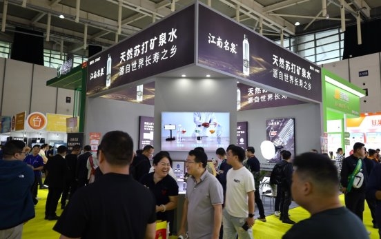 走进“江南名泉天然苏打矿泉水”展位,一股兼具高端质感与天然健康气息的氛围扑面而来。展区设计以黑金为主色调,构建层次分明的高端天然苏打矿泉水的产品形象,打造沉浸式品牌体验空间。黑金配色的克制美学,既契合当下消费市场盛行的极简风与轻奢感,同时也打破传统水饮展位的传统印象,让每一位驻足者直观感受“从品质好水到高端生活方式符号”的品牌跃迁。