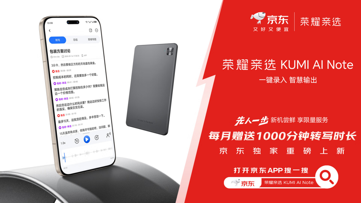 伴随荣耀平板新品同步开售的,还有荣耀亲选KUMI AI Note录音卡。这款智能配件集一键录音、声纹识别、多语言转写等实用功能于一身,并能智能识别录音场景,配合长续航设计与每月1000分钟转写时长赠送,成为学习、采访、会议与培训场景的得力助手。即日起,用户可在京东选购,到手价699元。
