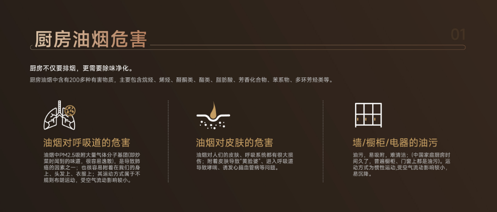 展开来看,烹饪健康涉及①高温爆炒带来的浓烈呛鼻油烟 ②受空调 / 通风气流逸散的 PM2.5 细颗粒 ③舞铲颠锅等动作影响传统烟机吸排 ④烹饪调料与热锅热油激发的迅猛烟气 ⑤老旧烟机无法充分满足排烟需求 ⑥管道 / 出风口 / 止逆阀等区域无法监测的 PM2.5 逸散;烹饪舒适度涉及烹饪时的高温油烟扑面、避免油烟侵袭客厅的厨房密闭,以及难以控制的噪音困扰。