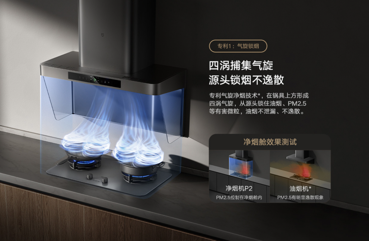 国内的米家智能净烟机 P2 也搭载了此核心技术——动态微粒捕集技术(IQV),根本实现了从被动吸附到主动控制气流轨迹的本质突破。