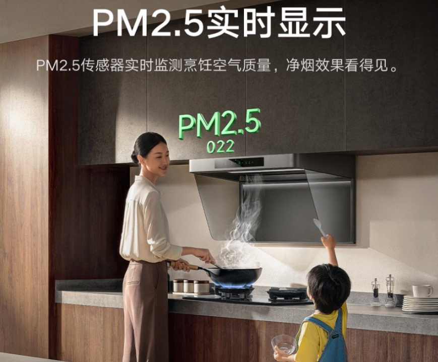 更值得关注的是其主动净化能力:内置的双碳基负离子净化装置可释放超 2100 万 /cm3 高浓度负离子,不仅能高效去除 PM2.5,更能抑制空气微尘及厨房台面表面细菌滋生,实现 24 小时全天候空气守护(非烹饪状态下)。