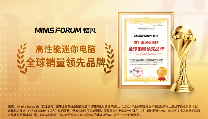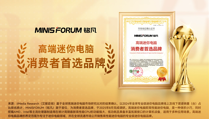 基于艾媒自主研发并获得省部级重大科技专项立项的CMDAS大数据系统监测及严格的调查,以及对中国(不含港澳台)高性能迷你电脑行业研究比对的结果进行统计确认,铭凡荣获全球领先的新经济产业第三方数据挖掘和分析机构iiMedia Research(艾媒咨询)授予的“高性能迷你电脑全球市占率领跑者”“AI迷你电脑全球创新领导品牌”“AI迷你电脑行业品牌”“AI迷你电脑行业领先品牌”“高性能迷你电脑全球销量领先品牌”“高端迷你电脑消费者品牌”市场地位确认。