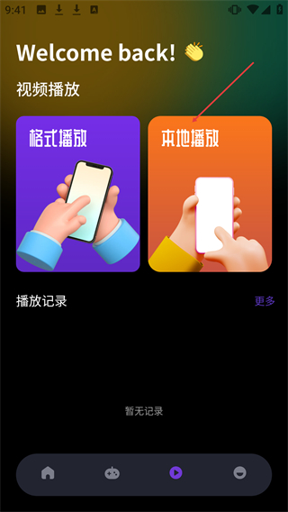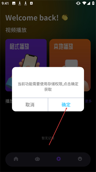 1、在显示【Welcomeback!】的页面点击【本地播放】选项,可触发权限请求弹窗。