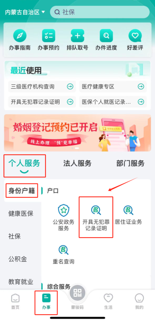 2.找到“个人服务-身份户籍”板块下的“开具无犯罪记录证明”,点击即可进入;