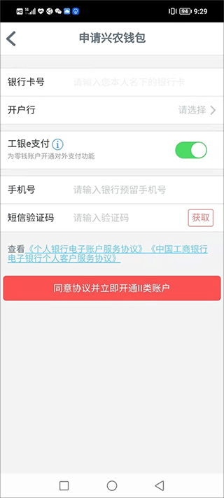 4、输入银行卡号,然后输入手机号获取验证码,点击下方“同意协议并立即开通二类账户”。