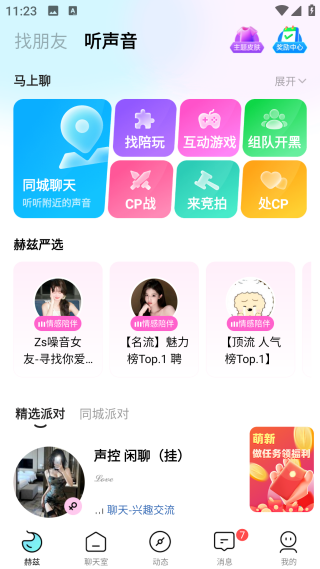 6、在【听声音】板块中,有同城聊天、找陪玩、互动游戏、组队开黑、CP站、来竞拍、处CP等玩法;
