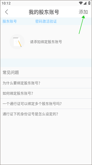 2、点击右上角【添加】,添加个人股东账号,在常见问题中会提供相关的绑定帮助;