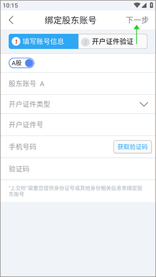3、在进入的新页面中,按信息提示依次输入个人信息,并获取验证码,等系统通过后,就可点击“下一步”,进入开户证件验证环节,完成这两步后系统将会完成绑定股东账号流程.
