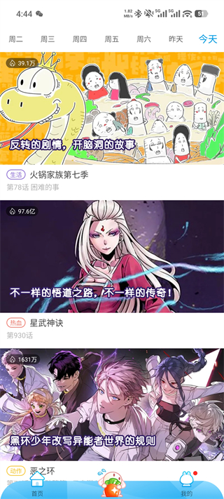 2、进入更新页,可以根据不同的时间查看漫画更新聂荣,也可以标记自己喜欢的漫画;