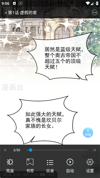 3、全屏沉浸式的阅读体验,提供多种功能设置,调节亮度、自动阅读,用书签标记进度,参与弹幕互动等;
