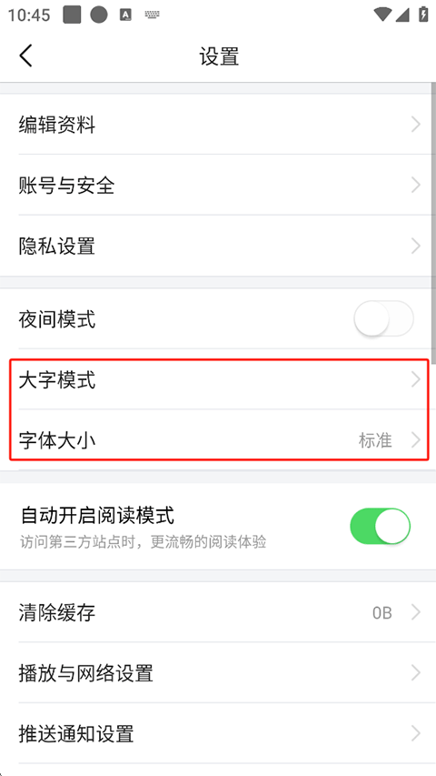 2、在设置中提供编辑资料、账号与安全、隐私设置、夜间模式、大字模式、字体大小等功能;