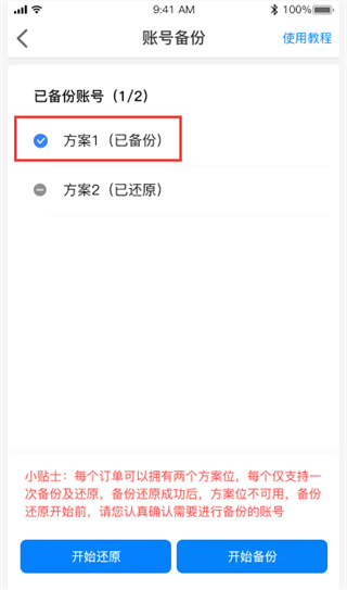 4、备份完成后账号数据会显示在方案位置,方便后面恢复使用。