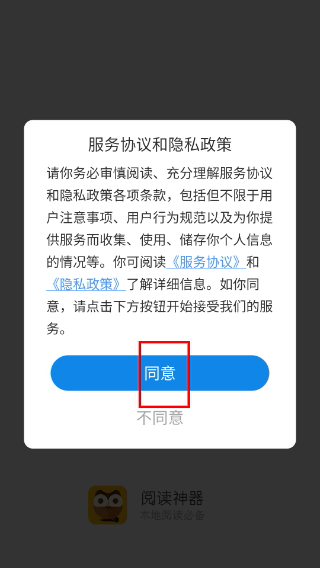 1、打开阅读神器APP,在服务协议弹窗中点击【同意】,进入主界面。