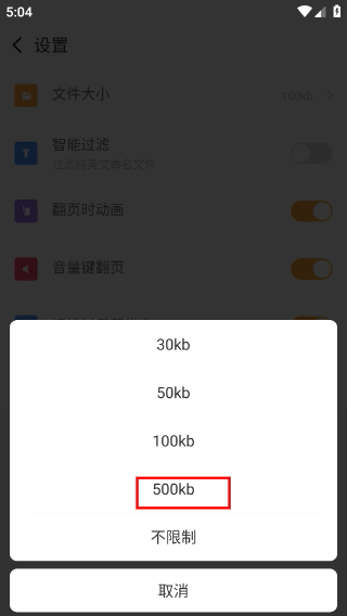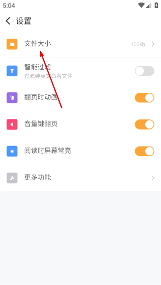 3、在设置页面,点击【文件大小】选项,弹出文件大小选择窗口。