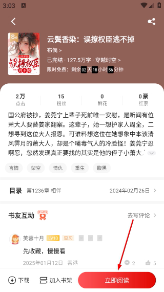 3、在小说详情页,点击【立即阅读】按钮,进入小说阅读界面。