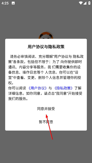 1、打开APP,在用户协议弹窗中点击【同意并接受】,进入首页界面。