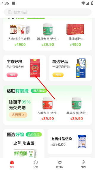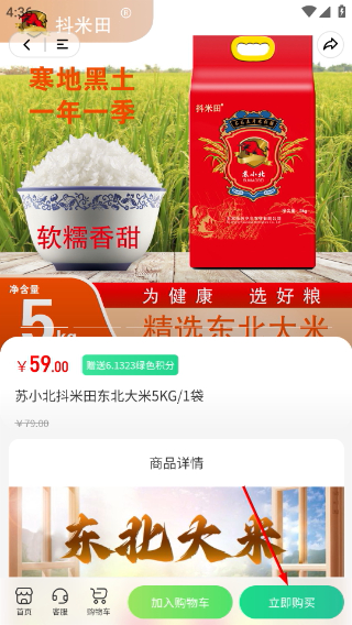 2、在首页,点击目标商品(如东北大米)的抢购入口,进入商品详情页。