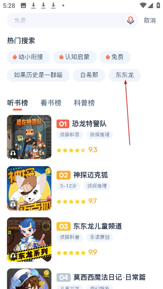 2、在搜索页面的热门搜索区域,点击【东东龙】标签,快速进行相关内容的搜索。
